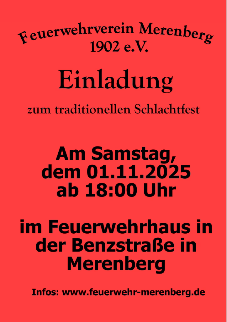 Am Samstag, dem 01.11.2025, ab 18.00 Uhr ist es wieder so weit: Das traditionelle Schlachtfest bei der Merenberger Feuerwehr ist angesagt.